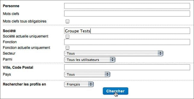 Pour retrouver une personne ayant, par exemple, fréquenté les mêmes établissements que vous ou travaillant dans une société en particulier, cliquez sur l’onglet Recherche. Sur la page qui s’affiche, remplissez un ou