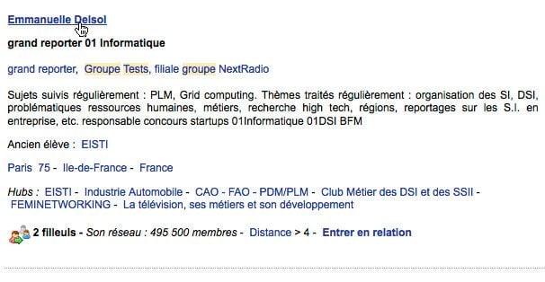 Si vous cliquez sur l’un d’entre eux, la page de mise en relation apparaît. En cliquant sur Entrer en relation, vous pouvez rédiger une demande afin de l’inviter à figurer parmi vos propres contacts.