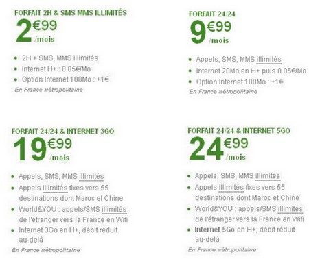 En entrée de gamme, l’opérateur s’approche du forfait Free à 2 euros. Il abaisse le prix de son forfait 2 heures d’appels (SMS + MMS illimités) à 2,99 euros/mois, contre 3,99 euros/mois, en le faisant bénéficier d’une option Internet mobile de 100 Mo à 1 euros/mois. Cette option bénéficie aussi au forfait 24/24 à 9,99 euros/mois (le quota passant à 120 Mo dans ce cas).