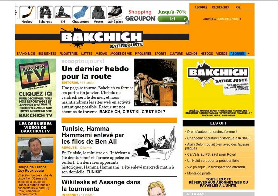 Le lancement d’un hebdomadaire payant du même nom n’a pas suffi à sauver le journal satirique. Dans un éditorial publié sur le site Bakchich.info, Nicolas Beau, le directeur de la rédaction, l’explique : « Une page se tourne. Bakchich va fermer ses portes fin janvier, annonce t-il. Nous sommes comme les chats qui meurent lorsqu’on les empêche de rêver. »