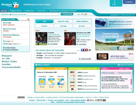 Un portail ergonomiqueBouygues a particulièrement soigné le portail Web qui servira de point d’ancrage à ses abonnés ADSL. L’opérateur l’a voulu personnalisable ‘ à la Netvibes ‘, c’est-à-dire que l’abonné peut