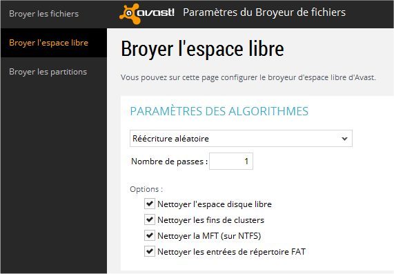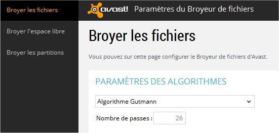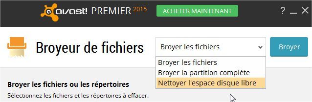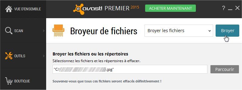 À partir de la fenêtre principale, cliquez sur Outils puis Broyeur de fichiers. Vous choisissez alors ce que vous souhaitez effacer : un fichier, plusieurs ou un dossier complet. Cliquez ensuite sur le bouton Broyer, et Avast se charge du reste.