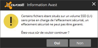 Le cas échéant, il faudra donc vous tourner vers un outil vraiment spécialisé dans l’effacement sécurisé sur supports non magnétiques. Avast 2015, annoncé par son éditeur comme « SSD-friendly », affichera d’ailleurs un message d’avertissement s’il détecte que les fichiers à effacer sont stockés sur un tel support.
