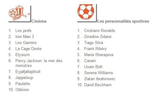 Du côté des personnalités, le podium est entièrement féminin. C’est Rihanna qui l’emporte devant Kim Kardashian et Beyonce. Rihanna arrive également en tête des recherches concernant les chanteurs ou groupes musicaux. Au vu du succès de ses titres dans l’Hexagone, cela n’étonne pas. En 2013, deux de ses singles ont été vendus à plus de 100 000 exemplaires. Elle prend même la tête de ce classement dans plus de vingt pays ! En France, elle devance Beyonce et Madonna. Une seule française entre dans ce top 10, Charlotte Gainsbourg.