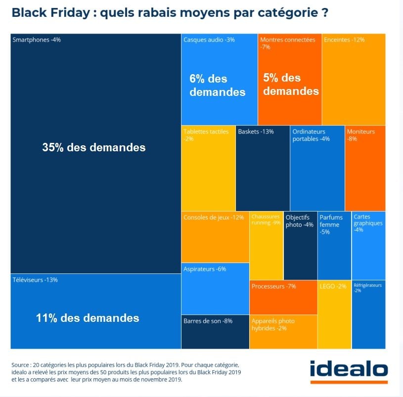Le comparateur de prix Idealo tente d’apporter une réponse à cette question. Pour cela, il a analysé ce qui s’est passé lors de l’édition 2019 du Black Friday et quels avaient été les produits les plus recherchés. Les smartphones arrivent en tête avec 35% des demandes, suivi par les téléviseurs avec 11%. Viennent ensuite les casques audio, les montres connectées et les enceintes. Dans le graphisme ci-dessous (cliquer sur l’image pour agrandir), la taille des rectangles est proportionnelle au pourcentage.