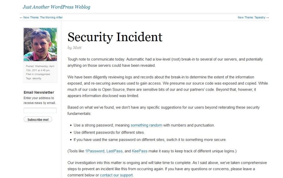 Plus important pour les centaines de milliers d’utilisateurs du service, dont tous les anciens utilisateurs de Windows Live Spaces qui ont récemment migré vers WordPress : leurs mots de passe. Si ceux-ci sont stockés de façon cryptée, ils demeurent faciles à découvrir pour un pirate s’ils sont trop « faibles ». Matthew Mullenweg en profite donc pour rappeler certaines règles de base : utiliser un mot de passe complexe, avec nombres et ponctuation, et surtout utiliser des mots de passe différents sur différents sites.
