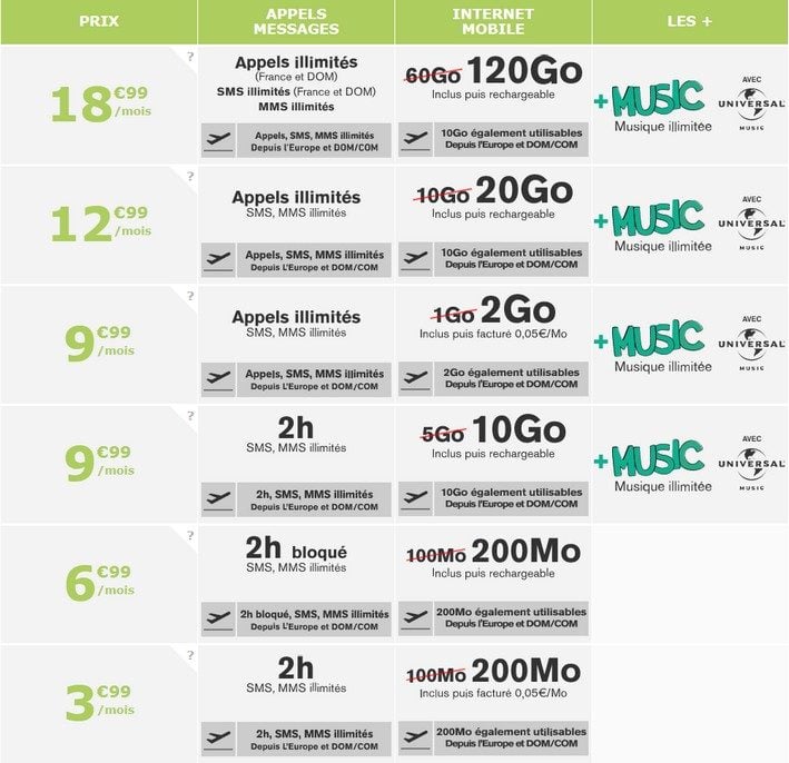 Ainsi le forfait SIM 60 Go passe à 120 Go et le forfait 100 Mo à 200 Mo en restant respectivement à 18,99 euros par mois et 3,99 euros par mois.
