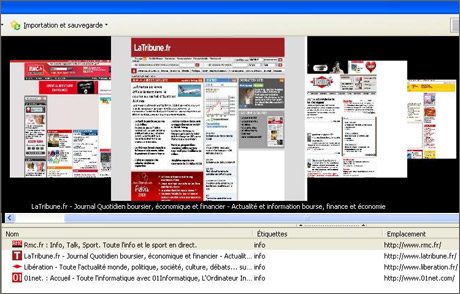 écran, sous forme d’album en carrousel (voir capture) ou de mosaïque, un mode de visualisation déjà proposé par Internet Explorer pour ses onglets.Bookmark Previews agrémente ainsi la navigation au sein de sa bibliothèque de marque-pages et permet au passage de détecter les liens ‘ morts ‘. Cette extension, qui n’est pas nouvelle, a été primée parmi les