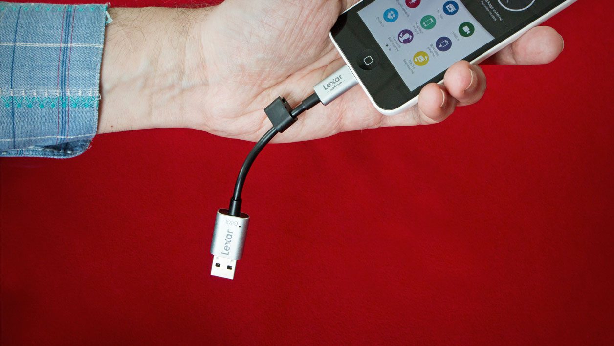 Terriblement pratique pour ne pas être à court de stockage, la Lexar JumpDrive C20i est à la fois une clé USB de 64 Go et un câble de transfert pour les appareils mobiles d’Apple.