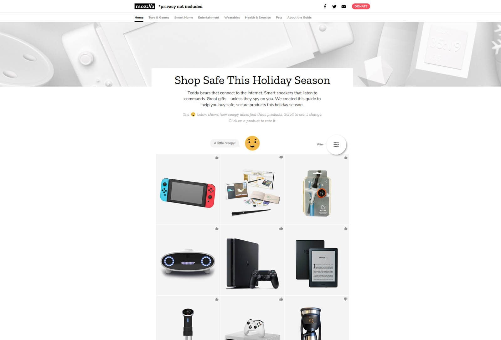 Mais la liste de Mozilla contient surtout un filtre qui permet de trier les produits selon leur caractère suspect (creepy en anglais). Et c’est là que cela devient intéressant, puisqu’un seul appareil s’avère seulement « un peu louche », à savoir la Nintendo Switch.