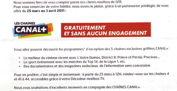 Canal+ devient un habitué de ce genre d’opérations qui consiste à proposer gratuitement ses chaînes payantes aux abonnés de fournisseurs d’accès à Internet. Après les Freenautes, en janvier dernier, c’est au tour des clients de SFR d’en bénéficier.