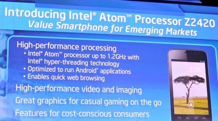 Intel a présenté une nouvelle plateforme processeur pour smartphones, incorporant une puce Atom, à faible consommation, plus particulièrement destinée au segment des smartphones entrée de gamme.
