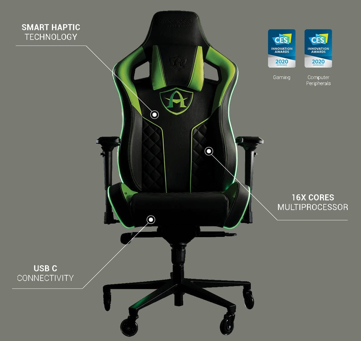 On ne plaisante pas chez Arcadeo. Nouvel arrivant sur le marché ultra bondé du fauteuil pour gamer, cette société présente à Las Vegas sa première création qui est bien plus – vous vous en doutez – qu’un simple meuble où poser votre fessier de joueur. C’est la première chaise gaming connectée au monde selon la marque, adaptée aux plaisirs vidéoludiques et, plus largement, aux divertissements numériques.