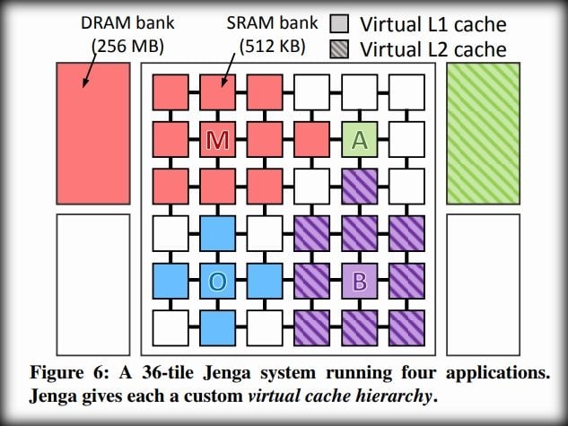 L’idée de Jenga est donc de créer des niveaux de cache virtuels à partir des mémoires L3 et L4, et cela en fonction des besoins de chaque application. Parfois, il n’y aurait qu’un niveau virtuel, constitué de L3 ou de L4 ou d’une combinaison des deux. Parfois, il y aurait deux niveaux virtuels, constitué de L3 ou de L4 ou d’une combinaison des deux. Tout est possible, à condition que la performance soit globalement augmentée. L’allocation des ressources est réalisée par un algorithme plutôt complexe qui calcule la configuration optimale de la mémoire toutes les… 100 millisecondes. Une cuisine qui reste totalement transparente pour l’application.