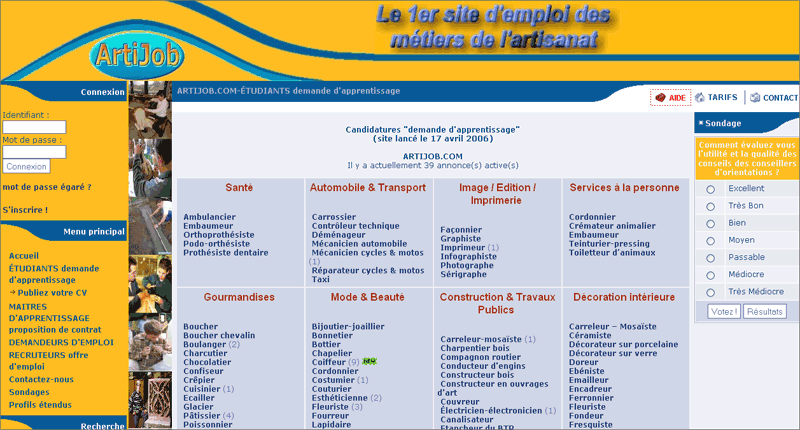 accueillir les propositions d’emplois de taxidermiste, de fleuriste ou bien de cordonnier… Au total, 11 secteurs sont répertoriés. Artijob souhaite aussi mettre en relation étudiants et maîtres d’apprentissage. Mais les annonces ne sont