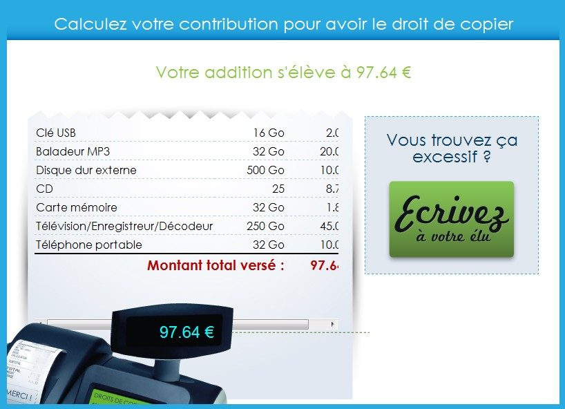 Le site propose aux internautes un outil de calcul de leur contribution. Ils peuvent se constituer un panier des produits « taxés » en précisant la capacité du support ou le nombre d’unités (CD, DVD…), puis demander « l’addition », soit le montant total de la redevance. Le test vaut pour des produits qui seraient achetés en France ou avec acquittement des droits de douane. Si les visiteurs estiment que la facture totale est salée, c’est-à-dire « en décalage avec leurs usages réels », ils ont la possibilité d’envoyer un courrier type à leur député, histoire de faire pression.