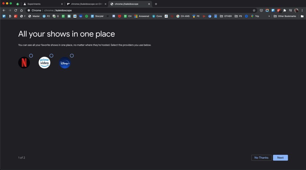 Kaleidoscope, c’est son nom, est accessible depuis Chrome Canary en saisissant c dans la barre d’adresses. Le fonctionnement de cette page reste toutefois assez flou. Si l’utilisateur est invité à sélectionner les plates-formes auxquelles il est abonné (Netflix, Prime Video, Disney+), le processus ne va pas plus loin pour l’instant. Google serait en train de tester cette nouvelle fonctionnalité en interne.