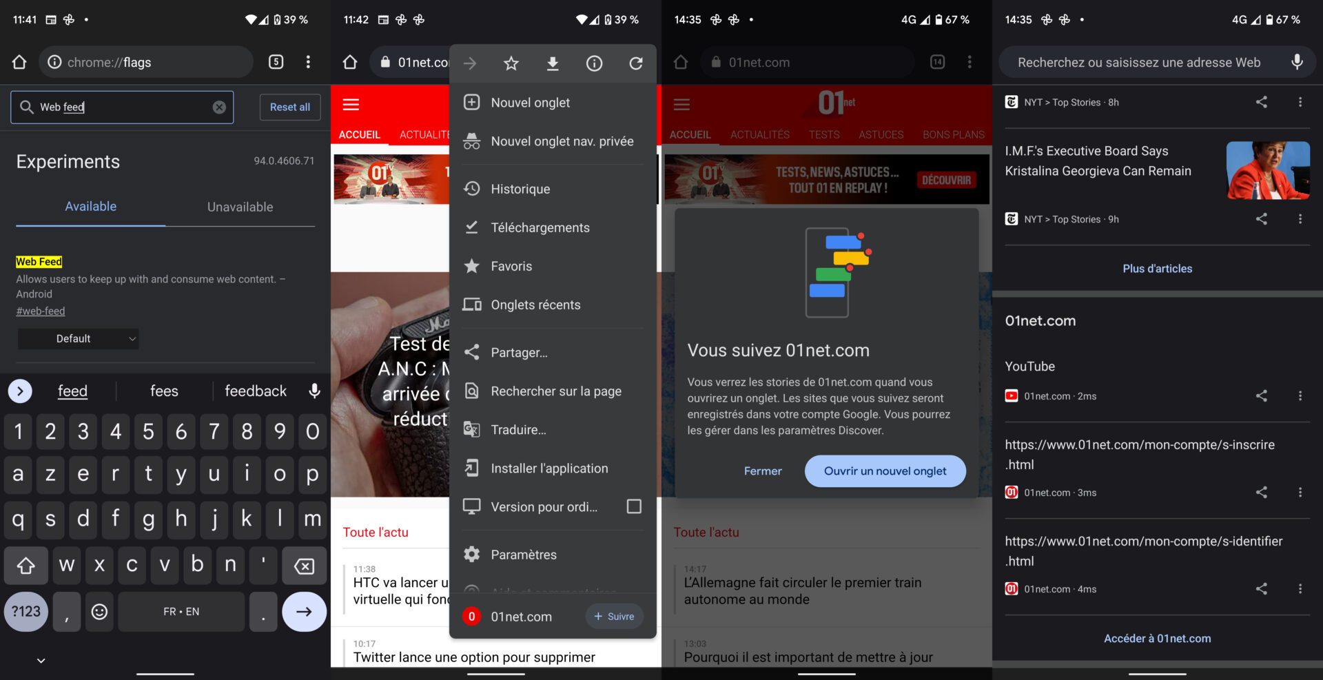 Ce projet semble avancer puisque Google vient de l’intégrer à la dernière version stable de Chrome sous Android. La fonction, qui n’est pas disponible par défaut requiert l’activation d’un flag, accessible via l’adresse chrome://flags/#web-feed. Après l’avoir activé et redémarré Chrome, le bouton est présent dans le menu principal de Chrome lorsque vous visitez un site Web.
