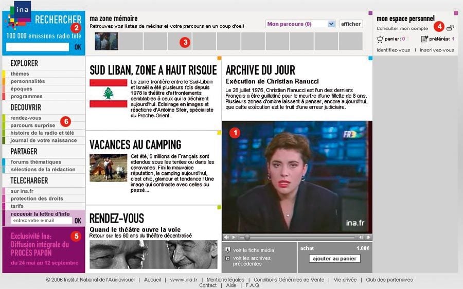 www.ina.fr/archivespourtous.1 – Au centre, l’espace principal, où l’on voit les extraits sélectionnés. Ici sont présentées des archives liées à l’actualité, et qui par définition changent fréquemment.