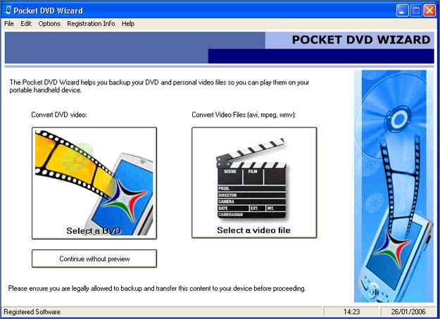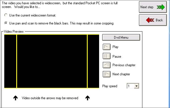 avancées de Pocket-DVD-Wizard, comme la possibilité de retailler (par Pan and Scan) un film 16/9 en 4/3.Cliquez sur ‘ Select a DVD ‘, puis choisissez l’unité disque de votre CD et désignez l’emplacement du dossier ‘ VIDEO_TS ‘. Il se peut que le logiciel ne puisse pas