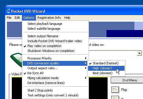 Toujours dans le menu ‘Options ‘, choisissez la qualité de la conversion sous ‘ DVD Conversion Quality ‘. Le mode ‘ Standard ‘ est de loin le plus rapide et