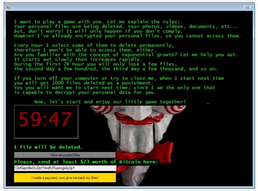 Ambiance film d’horreur garantie avec « Jigsaw », le petit dernier dans la famille grandissante des ransomware. Diffusé au travers des sites de téléchargements ou par des sites pornos, ce malware chiffre les fichiers puis informe la victime qu’elle doit payer l’équivalent de 150 dollars en bitcoin pour récupérer la clé de déchiffrement. Classique, me direz-vous. Là où la chose commence à devenir vicieux, c’est que le malware va progressivement augmenter la pression psychologique sur la victime. A chaque heure qui passe, il va augmenter le montant de la rançon et – comble du sadisme – effacer définitivement une partie des données: quelques fichiers le premier jour, des centaines de fichiers le deuxième jour, des milliers le troisième jour, etc.