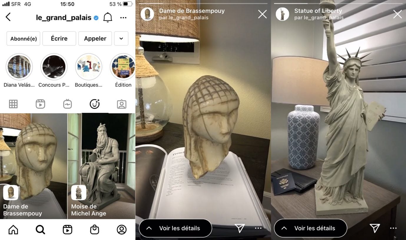 Où profiter de cette « nouvelle expérience » ? Vous cliquez sur l’onglet « effets » (l’icône smiley – voir ci-dessus) des profils respectifs de ces trois institutions, et vous trouverez des oeuvres en 3D : une Statue de la Liberté, de Moise, de l’Aurige de Delphes ou encore de la Dame de Brassempouy exposées au Grand Palais ou encore celle de la Venus de Milo de la Galerie Perrotin. Mais aussi, le Bassin d’Apollon grandeur nature sur votre smartphone du Château de Versailles. À noter : ces effets ne sont disponibles que sur l’appli mobile.