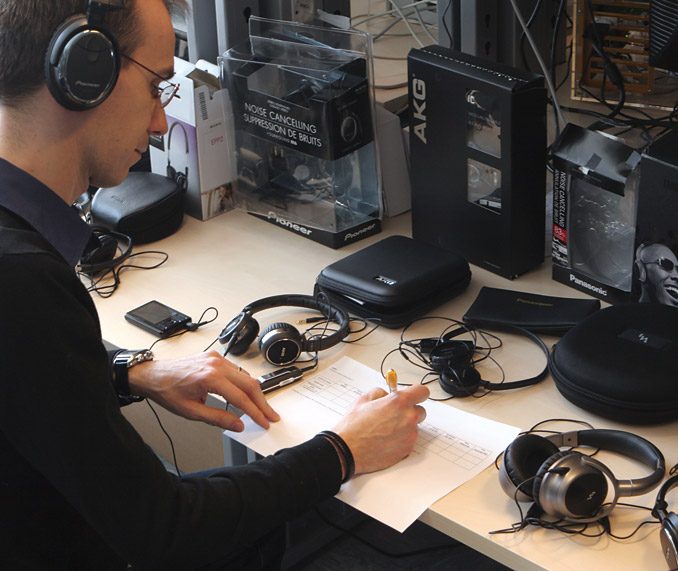 Rien ne remplace l’oreille humaine pour juger la qualité audio. Un jury a évalué la qualité des casques en écoutant des morceaux de musique de tous les genres sur un baladeur numérique. L’efficacité de réduction du bruit a été évaluée avec et sans musique, dans des environnements sonores de bureau, d’avion et de train, des enceintes restituant des enregistrements audio de ces environnements.