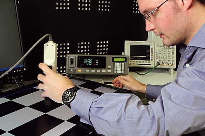 Mesures techniques. Avec une sonde optique Minolta CA-210 et une sonde de calibration X-Rite, nous avons mesuré les angles de vision et la qualité de rendu d’image de chaque moniteur avec ses réglages d’usine et après calibration. Le temps de réponse est mesuré à l’aide d’une sonde photoélectrique, puis évalué en prenant plusieurs photos d’un objet en mouvement à l’écran.