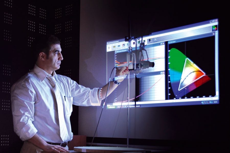 Notre procédure consiste à faire défiler différents niveaux de gris afin de mesurer, à l’aide de notre sonde colorimétrique, la fiabilité et la stabilité du rendu. Le gris est la couleur qui fait appel aux trois couleurs primaires (RVB) en même temps, et qui permet ainsi de mesurer la fiabilité du rendu obtenu en fonction de ce qu’affiche l’ordinateur. La stabilité traduit la capacité du vidéoprojecteur à maintenir le même rendu en fonction de l’intensité des gris projetés. Plus la valeur est basse, meilleur est le rendu.