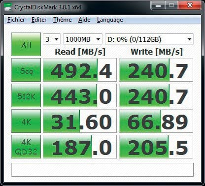 Le programme ATTO mesure les débits max en lecture et en écriture. Puis le programme CrystalDiskMark 3.0 donne des éléments de mesure de rapidité dans des conditions plus proches de la réalité. Il mesure aussi les débits moyens sur les petits fichiers (4 Ko), ainsi que les débits en pointe (test 4K QD32). Le programme AS SSD mesure le nombre d’opérations d’entrées/sorties (lecture ou écriture de données) que le disque est capable d’effectuer par seconde. Cela est important dans un environnement multitâche quand plusieurs programmes accèdent au disque simultanément.