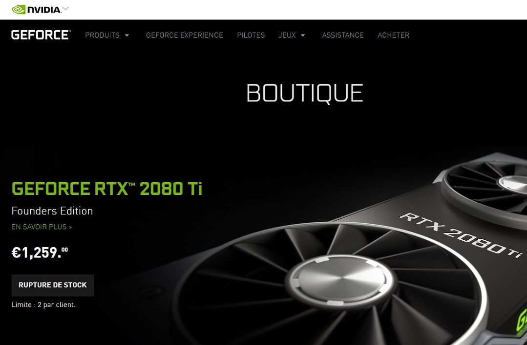 Les joueurs l’attendent avec impatience. La nouvelle carte graphique GeForce RTX 2080 Ti sera bientôt disponible. Nvidia avait annoncé le 27 septembre mais le constructeur semble avoir pris du retard et la date serait repoussée vers le 5 ou le 9 octobre. Quoiqu’il en soit, il faut être vigilant et surveiller les sites Web marchands pour l’obtenir au meilleur prix. La première piste consiste à se rendre régulièrement sur le site de Nvidia car la carte y est vendue seulement 1259 euros dans sa version Founders Edition avec 11 Go de mémoire graphique et une puce capable de monter à 1635 MHz. Hélas, elle est pour l’instant en rupture de stock.