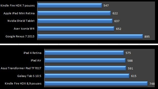 L’ardoise grand format d’Amazon se place en cinquième position de notre comparatif… devant l’iPad Air. Son écran au format 4:3 affiche une très belle image, confortable dans toutes les activités. Ses performances sont excellentes, son autonomie aussi. Même son capteur optique 8 mégapixels fait du bon boulot. Son système Fire OS, est une version d’Android tournée vers l’essentiel, et surtout vers l’achat de contenu en ligne, l’activité principale d’Amazon. A l’usage, c’est une des tablettes les plus agréables que nous ayons testées.