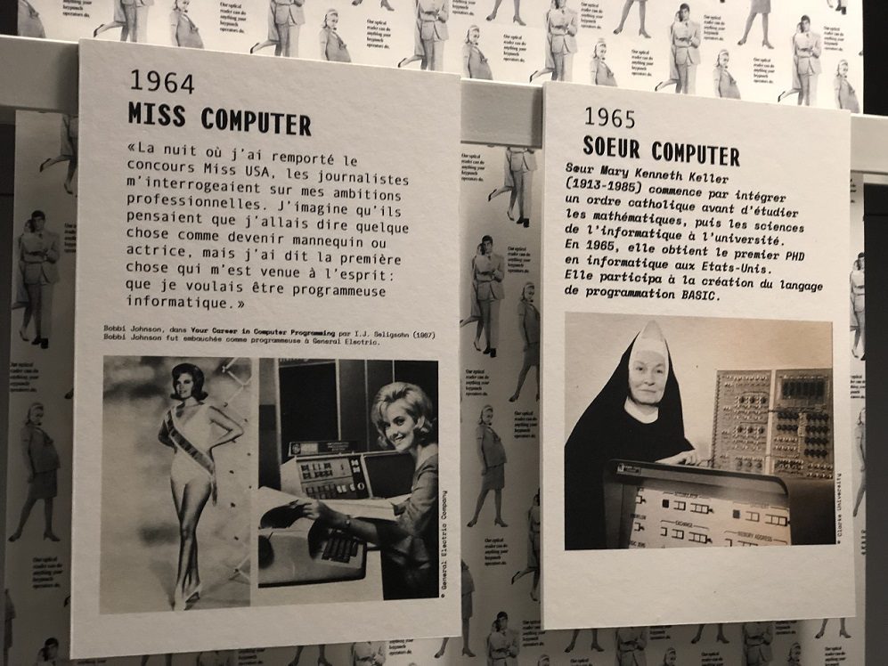 L’exposition invite à revenir à l’époque où les « ordinateurs portaient des jupes », selon les bons mots de Katherine Jonhson, une des figures de l’ombre de la Nasa dans les années 1960. D’abord de manière très pédagogique, une frise chronologique fournie replace les femmes au cœur de l’histoire numérique. De « Miss Computer » à « Sœur Computer », en passant par les « Demoiselles du téléphone » les archives remontent le temps depuis la première programmeuse du monde, Ada Lovelace.