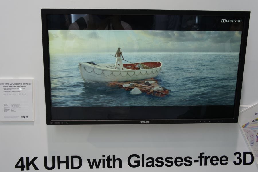 Enfin, Asus présente aussi sur son stand un écran capable d’afficher une image en relief sans imposer le port d’une paire de lunettes à l’utilisateur. Ce moniteur affiche une définition Ultra-HD en 2D, et Full HD en 3D. L’effet est bien meilleur que sur les écrans 3D sans lunettes que nous avons déjà pu regarder, mais il est encore loin d’être parfait…