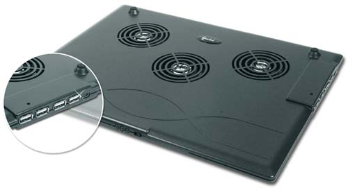 une vitesse de 1500 tours par minute afin de refroidir la partie inférieure du portable. Pour ne rien gâcher, cet accessoire intègre un hub USB 2.0 à quatre ports. C’est toujours pratique, compte tenu que certains portables n’ont que deux
