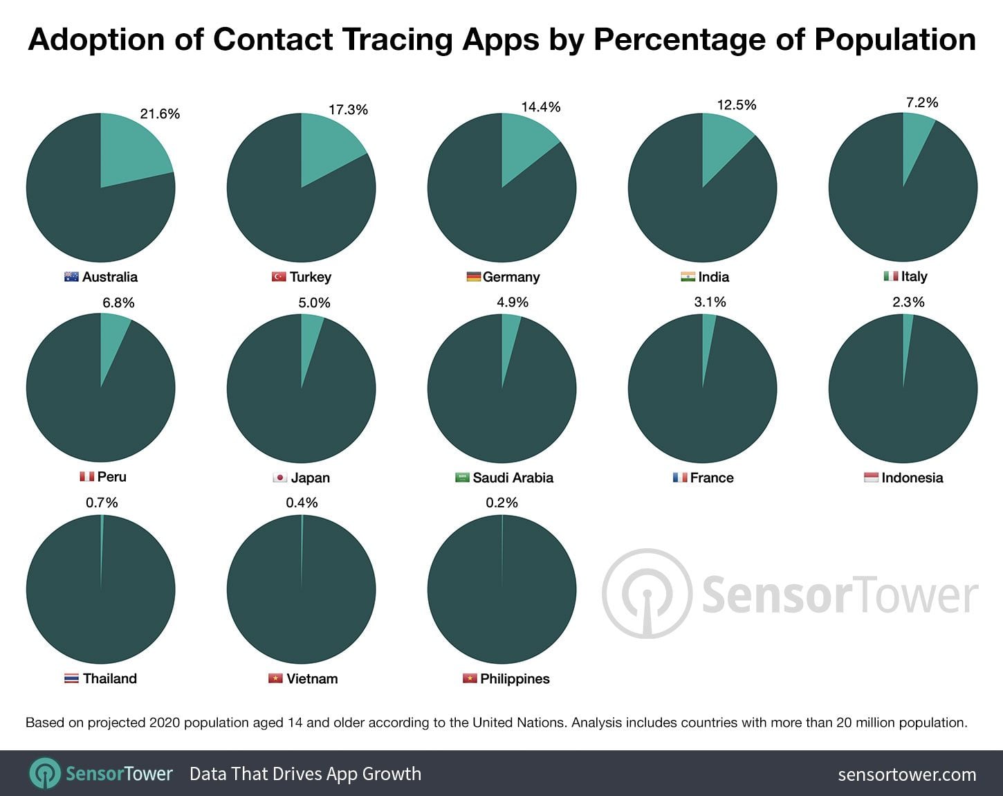 Sur près de 1,9 milliard d’habitants issus de 13 pays analysés, une étude menée par Sensor Tower révèle que 173 millions de personnes ont téléchargé une application contact tracing développée par leur gouvernement – soit 9,3 % de cette population agrégée. Trois fois moins élevé que cette moyenne, le taux de téléchargement de StopCovid en France est seulement de 3,1 %. Parmi les bons élèves, on trouve en revanche : l’Australie, la Turquie, l’Allemagne, l’Inde ou encore l’Italie.