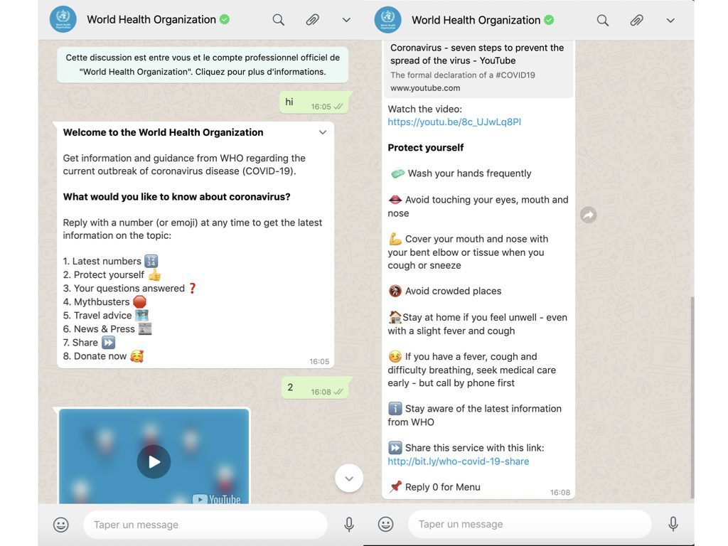 Le mode de discussion avec le chatbot est ludique. Il vous suffit de taper le numéro répertorié par le message pour avoir le récapitulatif des consignes à suivre. Truffé d’emoticones et agrémenté de médias en tout genre (vidéo, liens, images, etc.), les informations se veulent pédagogiques.