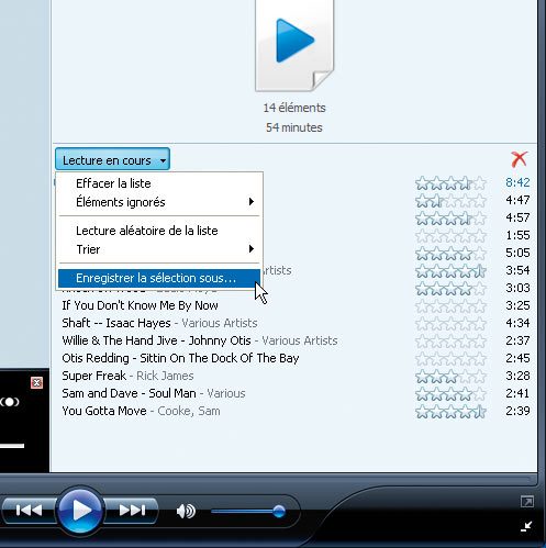 3 Cliquez sur la mention Lecture en cours, au-dessus de la liste, et choisissez Enregistrer la sélection sous. Saisissez le Nom du fichier puis un Type : Sélection