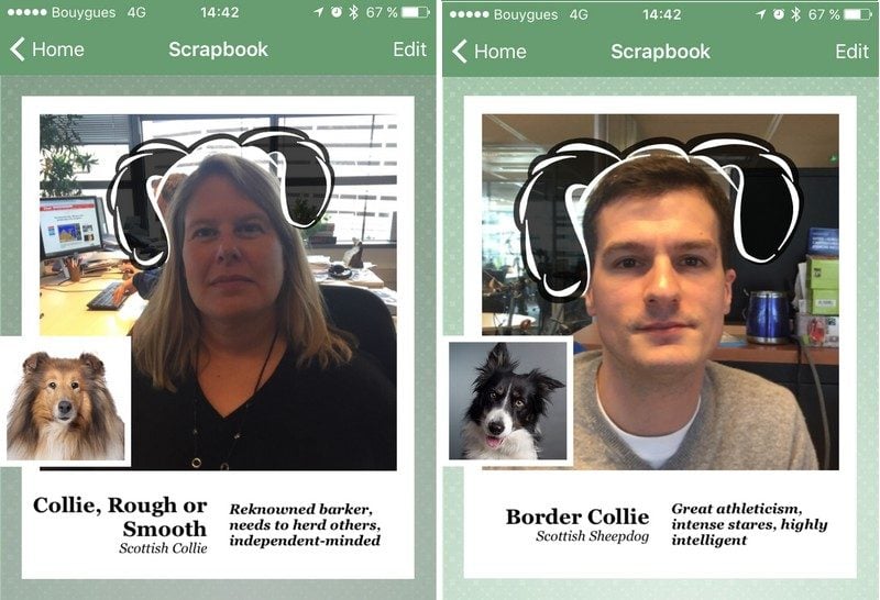 Mais le plus amusant, c’est qu’il fait de même avec les humains (et vous ajoute des oreilles au passage). Et qu’on se prend au jeu de comparer le profil psychologique avancé pour le toutou avec celui de l’individu photographié… Même si deux photos avec un léger changement, avec ou sans lunettes de soleil par exemple, donneront des résultats différents. L’intelligence artificielle à ses limites…