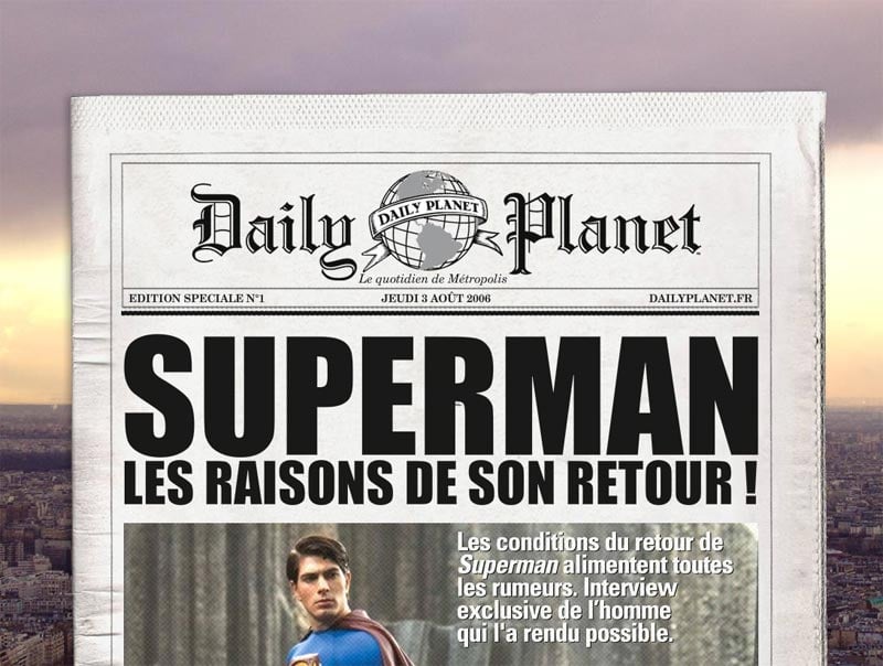 jeunes, rappelons que Superman fait le plus beau métier du monde puisqu’il est journaliste (hum…) au Daily Planet.Sur le site du journal, vous trouverez toutes les infos possibles sur le long-métrage, ainsi que de nombreux bonus, jeux, photos haute résolution, des témoignages d’internautes et des petites annonces pour le héros à la cape rouge. La