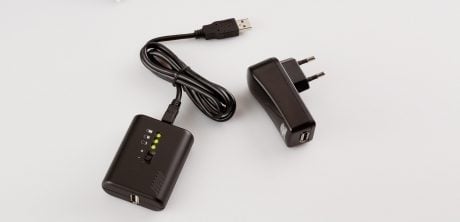 bloc chargeur mais avec seulement trois diodes témoins de charge vertes (au lieu de bleues), une entrée mini-USB pour le courant, une sortie USB de type A pour l’alimentation des appareils mobiles, un câble USB/mini-USB et une prise de courant à