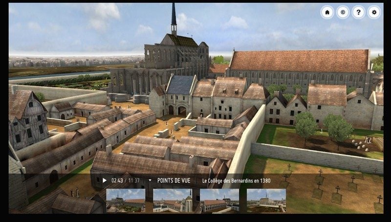 L’éditeur s’est associé aux équipes du collège des Bernardins et de l’Institut national des recherches archéologiques préventives pour reconstituer ce monument historique de la ville de Paris. Avec la participation de Marc Viré, archéologue et commissaire scientifique du projet, les équipes de Dassault Systèmes ont reconstitué, en quelques mois, le bâtiment tel qu’il était à la fin du Moyen Age et le font vivre au cours d’une visite interactive d’une douzaine de minutes. Le promeneur virtuel peut alors soit suivre le déroulé de la visite, soit l’interrompre et se déplacer dans « le film » à la manière de ce que propose Google avec Street View.