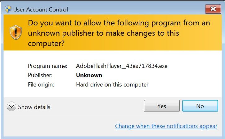 En effet, l’installation de la nouvelle version d’Adobe Flash se passe presque normalement, avec les mêmes messages et les mêmes fenêtres pop-up que le logiciel d’installation légitime. Et au final, le nouvelle version d’Adobe Flash est effectivement installée. Le seul moment où l’utilisateur peut avoir un doute, c’est lorsque Windows lui demande s’il faut bien exécuter ce fichier provenant d’un « éditeur inconnu ». Mais le message de cette alerte n’est pas forcément suffisant faire changer d’avis. A noter que ce test a été effectué sur une machine Windows 7 Service Pack 1. Il est possible qu’un ordinateur sous Windows 10 soit plus efficace au niveau de la détection.