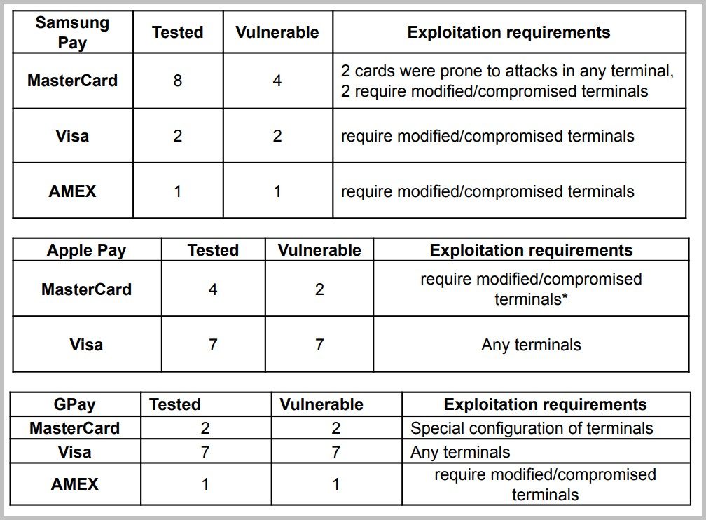 Dans cette étude, les chercheurs estimaient que ce type d’attaque n’était possible qu’avec la combinaison Apple Pay et Visa. À l’occasion de la conférence Black Hat Europe 2021, le chercheur en sécurité Timur Yunusov de Positive Technologies a montré que la situation était en réalité beaucoup plus complexe que cela. Il s’est penché non seulement sur Apple Pay, mais aussi Samsung Pay et Google Pay. Et il a essayé de les combiner avec les principales cartes du marché, à savoir Visa, Mastercard et Amex. Résultat : à chaque fois, il a trouvé un moyen de faire un paiement non authentifié et sans plafond !