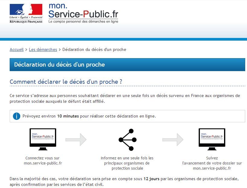 Le télédéclarant concerné par le décès d’un proche, devra préalablement disposer d’un compte sur mon.service-public.fr. La télédéclaration requiert ensuite l’acte de décès et diverses informations concernant le défunt dont son numéro de sécurité sociale. L’information est ensuite prise en compte par les organismes sociaux partenaires de la démarche sous 12 jours : essentiellement des caisses de retraite.
