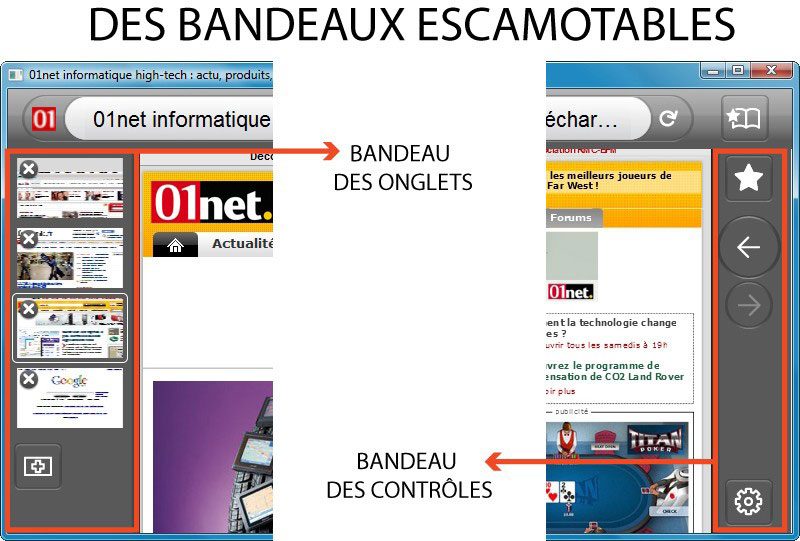 Les autres fonctions les plus courantes du navigateur – boutons avant et arrière, création d’un signet et réglages des paramètres du navigateur – sont accessibles sur un bandeau escamotable, masqué par défaut, qui s’affiche à droite de l’écran lorsque l’on fait glisser l’écran vers la gauche.