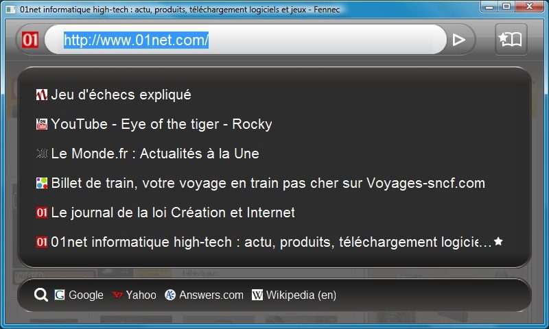 Un clic sur la barre d’adresse affiche l’historique des sites récents fréquemment consultés. Comme dans Firefox, il suffit de commencer à entrer du texte dans la barre d’adresse pour retrouver les sites déjà visités contenant les caractères saisis.
