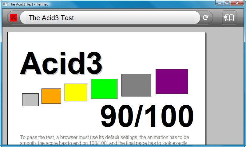 Comme on pouvait s’y attendre, le petit frère de Firefox se révèle très respectueux des standards. La bêta obtient 90/100 au test Acid3, soit légèrement moins que l’actuelle bêta de Firefox 3.5 (la version actuelle de Firefox plafonne à 71/100).