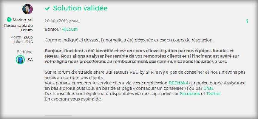 Dans les plaintes récentes toutefois, cette explication ne tient pas vraiment debout. Certains abonnés expliquent en effet que l’appel a été passé au plein milieu de la nuit, pendant qu’ils dormaient. Il doit donc s’agir d’un autre problème. Le 20 juin dernier, les équipes de RED ont visiblement (enfin !) trouvé. « Bonjour, l’incident a été identifié et est en cours d’investigation par nos équipes fraudes et réseau. Nous allons analyser l’ensemble de vos remontées client et si l’incident est avéré sur votre ligne nous procéderons au remboursement des communications facturées à tort », peut-on lire dans le forum.